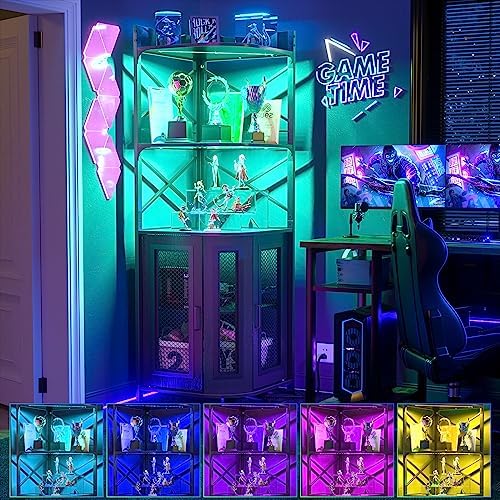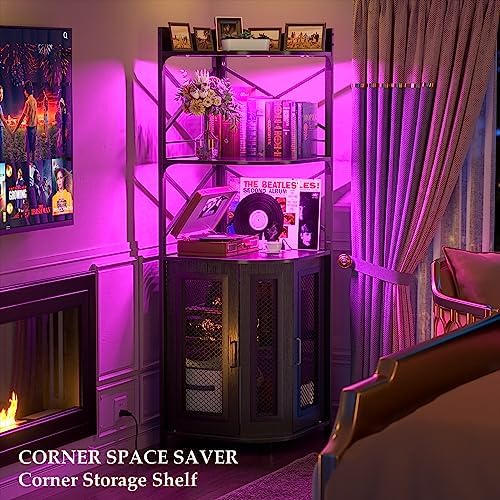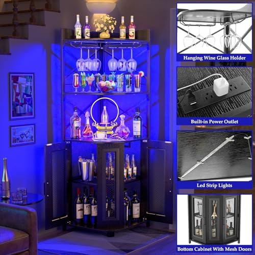 Aheaplus Industrial Corner Wine Cabinet with Charging Station, LED Strip, Glass Holder, Liquor Cabinet for Home