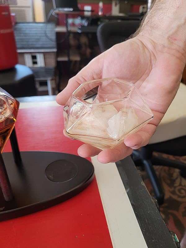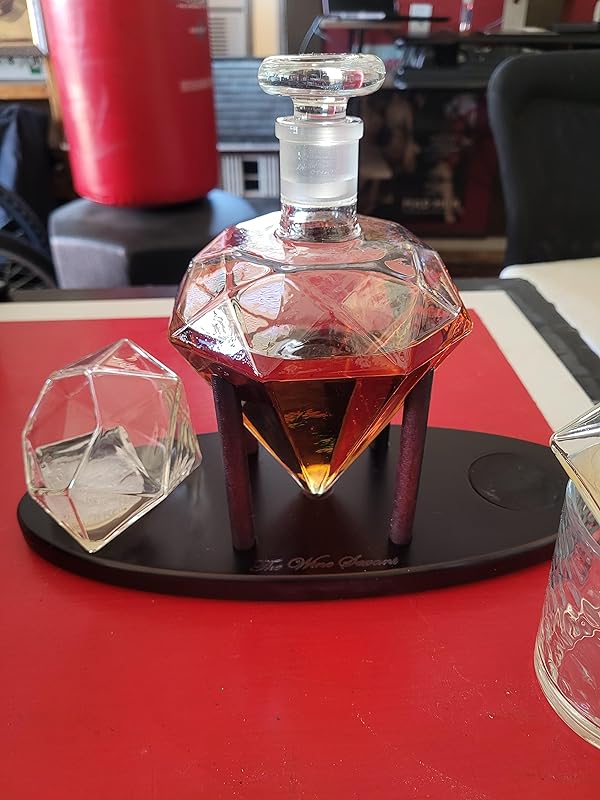 | Feature | LUXURIOUS DIAMOND WHISKEY DECANTER SET – This exquisite diamond decanter with a stunning mahogany wooden base exudes sophistication and luxury. A perfect statement piece for any bar or office, it elevates your whiskey experience with elegance. |