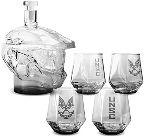 About this item BE MISSION READY: Raise a toast to a legend with this 6-piece decanter set paying homage to the popular Halo Infinite video game series. Equip yourself with the finest selection the UNSC has to offer. HIGH SCORES FOR STYLE: Drink to your favorite UNSC soldier with this stunning glassware set. The sculpted decanter and elegantly inscribed whiskey glasses make an impressive addition to any gamer’s inventory. HEROIC CENTERPIECE: The star of this glassware set is a 56-ounce decanter and stopper shaped like Master Chief’s iconic helmet. Includes four 11-ounce whiskey glasses with a United Nations Space Command design. LOCK ‘N LOAD: Entertain guests with this sleek barware set that’s great for displaying and enjoying. After a successful mission, toast with a glass of whiskey, bourbon, or other UNSC-approved refreshment. OFFICIAL HALO GEAR: Spartans can toast to their next big win using this officially licensed Halo Infinite decanter set. Perfect for Halo gamers ages 6+ and older if you’re drinking orange juice.