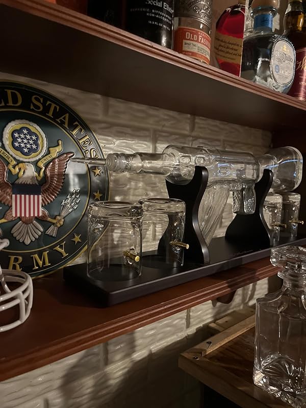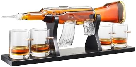 | Feature | DRINKING WHISKEY WILL NEVER BE THE SAME: Patent pending – Elegant and classy this large Decanter set is 22.5″ Wide x 8.5″ high Rifle Gun Decanter – Can you imagine how classy this will look in your bar. This Glass Whiskey Decanter Gun Will Start Your Drinking with a Bang |